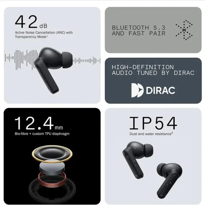 Elevate your audio experience with the CMF Buds 2a. These earbuds feature 12.4mm Bio-fiber drivers and Dirac sound tuning for thunderous bass. Ultra Bass Technology 2.0 adapts sound to your environment. Experience 42dB Hybrid Active Noise Cancellation, silencing frequencies up to 2900Hz. Switch to Transparency Mode for situational awareness.